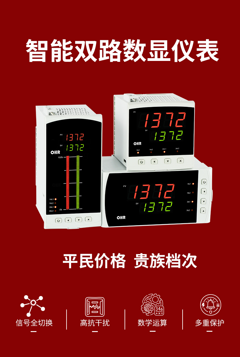 虹潤公司是專業(yè)生產(chǎn)數(shù)顯表的國家專精特新“小巨人”企業(yè),生產(chǎn)的智能雙路數(shù)顯儀表,具有全切換信號輸入,加減乘除數(shù)學(xué)運(yùn)算,高抗干擾,過壓過流保護(hù),RS485/RS232通訊等特點(diǎn)。產(chǎn)品獲得巡回檢測顯示方法及裝置、儀表殼體等2項(xiàng)國家發(fā)明專利,主持起草工業(yè)過程控制系統(tǒng)用模擬輸入兩位或多位輸出儀表、物聯(lián)網(wǎng)智能溫度儀表通用技術(shù)條件等2項(xiàng)國家標(biāo)準(zhǔn),,以及通信系統(tǒng)多通道數(shù)據(jù)采集控制終端規(guī)范軍用標(biāo)準(zhǔn),參與國際5G標(biāo)準(zhǔn)制定,取得雙回路數(shù)字顯示控制儀表等3項(xiàng)相關(guān)軟件著作權(quán)。產(chǎn)品廣泛應(yīng)用于電力、石化、冶金、化工、造紙、食品、輕工、制藥、熱處理、水處理、機(jī)械配套等各種工業(yè)現(xiàn)場。