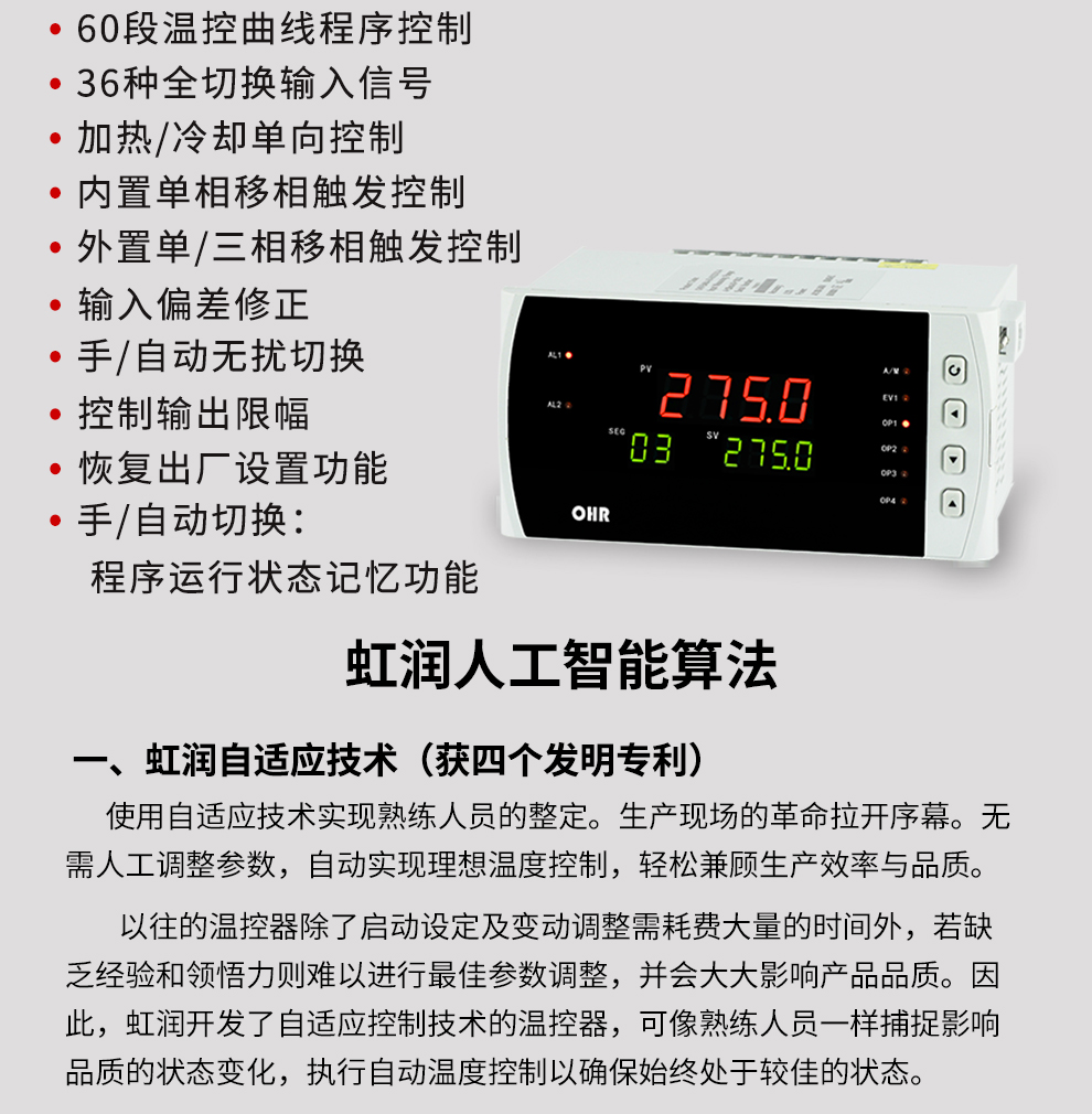 虹潤(rùn)公司是專業(yè)生產(chǎn)溫控器的國(guó)家專精特新“小巨人”企業(yè)。生產(chǎn)的程序段智能溫控器,具有真正人工智能算式,無(wú)需人工整定參數(shù),控制精度可達(dá)±0.1°C,60段溫控曲線程序,無(wú)超調(diào)、欠調(diào)等特點(diǎn)。產(chǎn)品獲得模糊PID控制儀及控制方法、人工智能調(diào)節(jié)器、智能化控制器、移相觸發(fā)控制器、閥門(mén)自動(dòng)手動(dòng)無(wú)擾動(dòng)操作控制方法及裝置等5項(xiàng)國(guó)家發(fā)明專利,主持起草智能溫度儀表通用技術(shù)條件、工業(yè)過(guò)程控制系統(tǒng)用模擬輸入兩位或多位輸出儀表、工業(yè)過(guò)程測(cè)量和控制系統(tǒng)用智能調(diào)節(jié)器等3項(xiàng)國(guó)家標(biāo)準(zhǔn),,以及通信系統(tǒng)多通道數(shù)據(jù)采集控制終端規(guī)范軍用標(biāo)準(zhǔn),參與國(guó)際5G標(biāo)準(zhǔn)制定,取得60段PID自整定調(diào)節(jié)器等3項(xiàng)相關(guān)軟件著作權(quán)。產(chǎn)品廣泛應(yīng)用于電力、石化,冶金、制藥、食品等幾乎所有工業(yè)現(xiàn)場(chǎng),實(shí)現(xiàn)精準(zhǔn)控溫,保障生產(chǎn)安全與質(zhì)量。