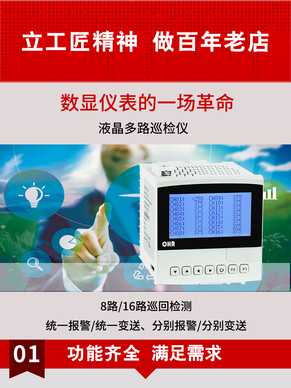 虹潤公司是專業(yè)生產(chǎn)多路溫度巡檢儀的國家專精特新“小巨人”企業(yè),生產(chǎn)的液晶多路巡檢儀,具有8路/16路測量通道,全切換信號輸入,統(tǒng)一報警統(tǒng)一變送輸出,分別報警分別變送輸出,RS485/RS232通訊等特點。產(chǎn)品獲得巡回檢測顯示方法及裝置、儀表殼體等2項國家發(fā)明專利,主持起草工業(yè)過程控制系統(tǒng)用模擬輸入兩位或多位輸出儀表、物聯(lián)網(wǎng)智能溫度儀表通用技術(shù)條件等2項國家標(biāo)準(zhǔn),以及通信系統(tǒng)多通道數(shù)據(jù)采集控制終端規(guī)范軍用標(biāo)準(zhǔn),參與國際5G標(biāo)準(zhǔn)制定,取得液晶多回路測量顯示控制儀等4項相關(guān)軟件著作權(quán)。產(chǎn)品廣泛應(yīng)用于電力、石化、冶金、制藥、水處理、機(jī)械配套等各種工業(yè)現(xiàn)場。