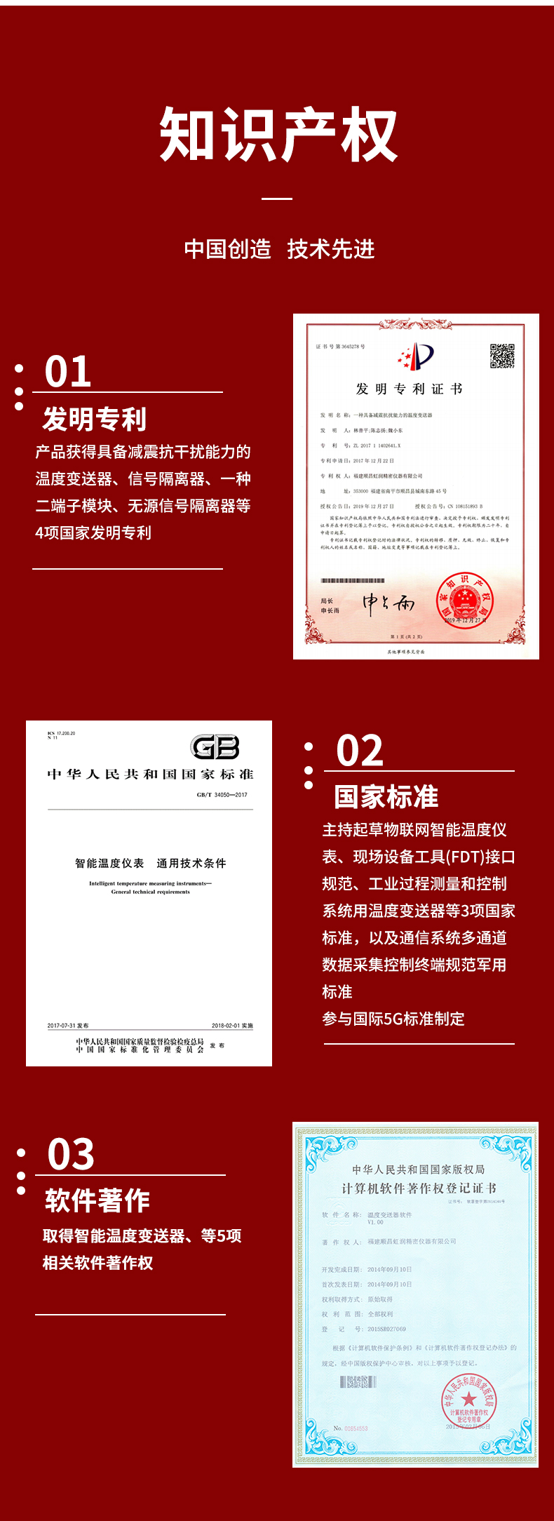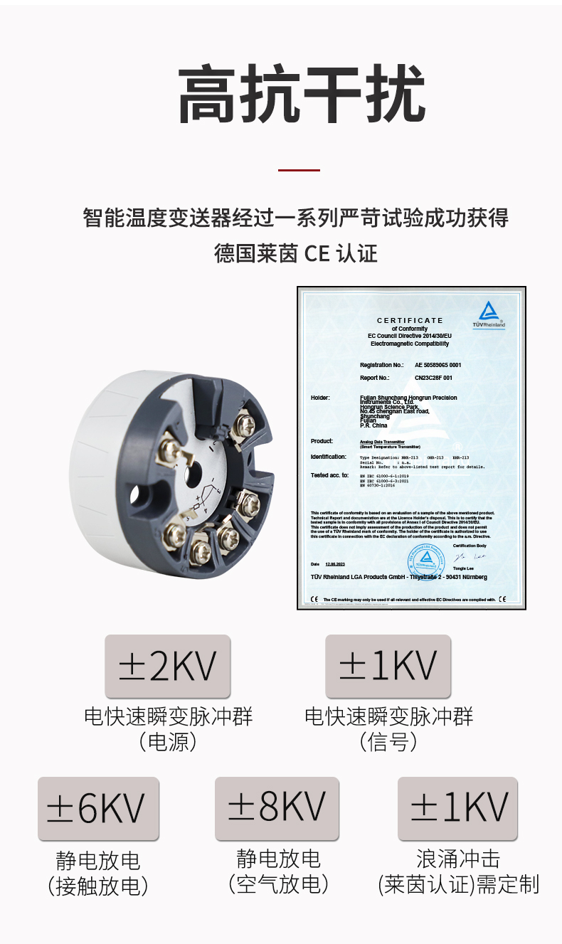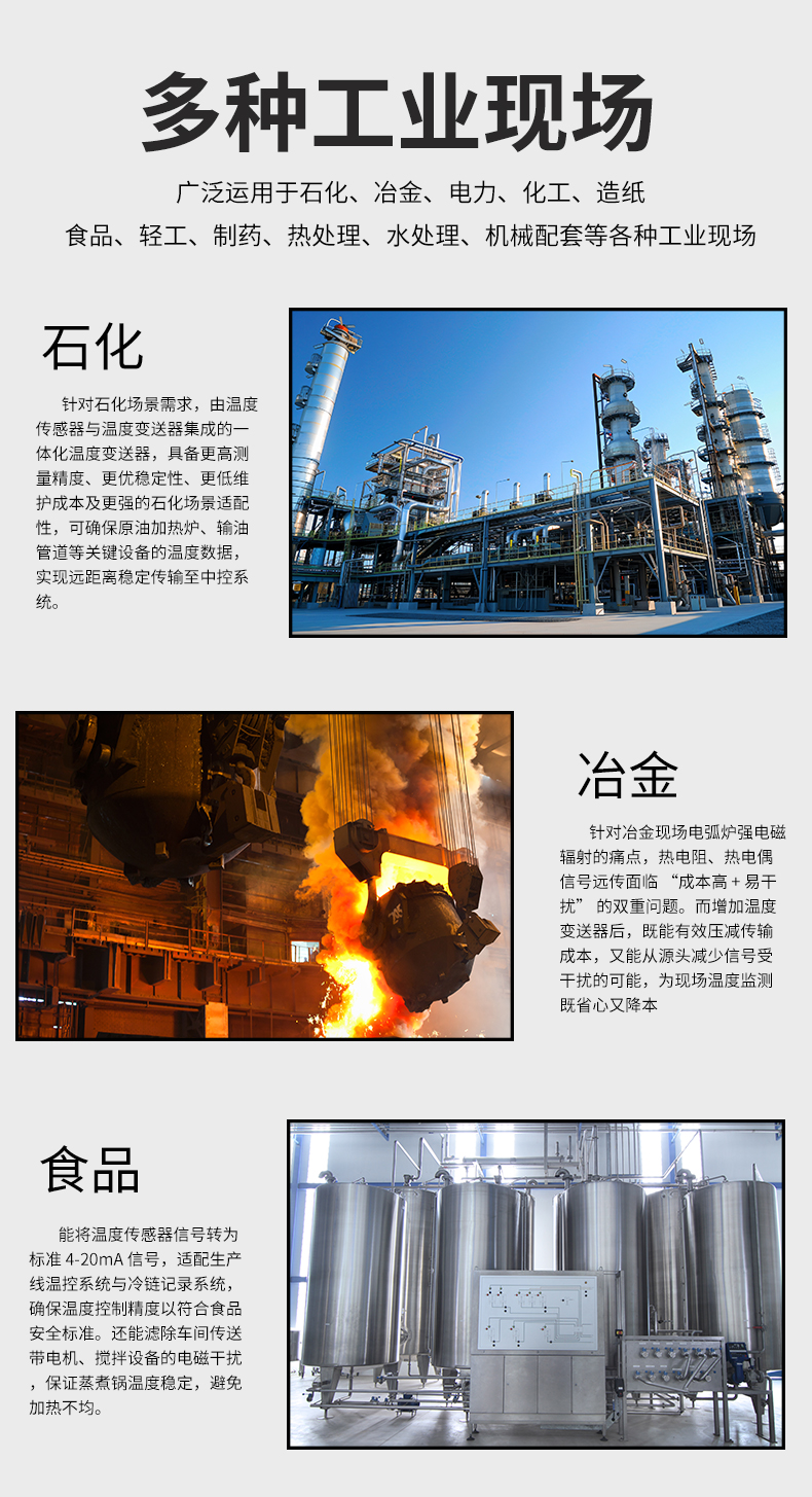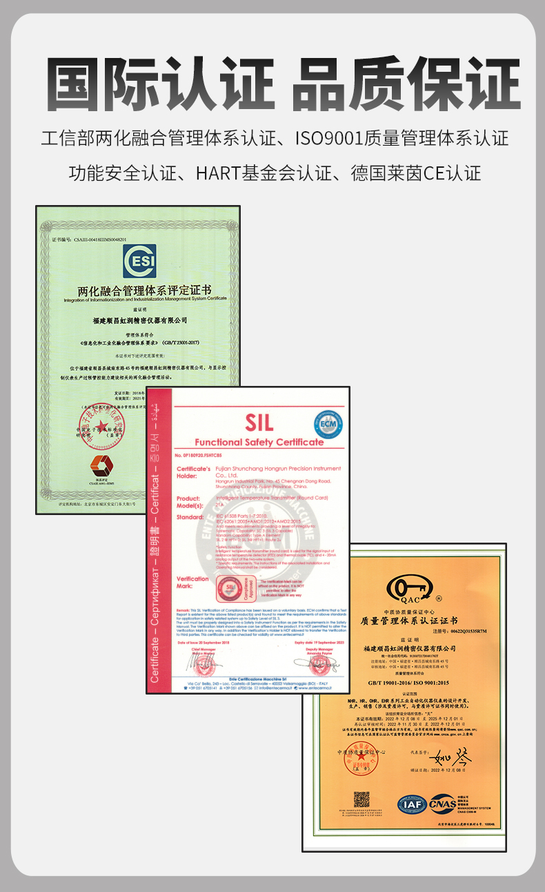 虹潤公司是專業(yè)生產(chǎn)溫度變送器的國家專精特新“小巨人”企業(yè)。生產(chǎn)的智能溫度變送器,具有適配各類溫度傳感器,精度高,穩(wěn)定性好,通過編程線修改輸入信號類型及量程,高抗干擾等特點(diǎn)。該產(chǎn)品不僅通過HART基金會認(rèn)證、德國萊茵 CE 認(rèn)證與 SIL 功能安全認(rèn)證,還獲得具備減震抗干擾能力的溫度變送器、信號隔離器、一種二端子模塊、無源信號隔離器等4項國家發(fā)明專利,主持起草物聯(lián)網(wǎng)智能溫度儀表、現(xiàn)場設(shè)備工具(FDT)接口規(guī)范、工業(yè)過程測量和控制系統(tǒng)用溫度變送器等3項國家標(biāo)準(zhǔn),以及通信系統(tǒng)多通道數(shù)據(jù)采集控制終端規(guī)范軍用標(biāo)準(zhǔn),參與國際5G標(biāo)準(zhǔn)制定,取得智能溫度變送器、HART溫度變送器等3項相關(guān)軟件著作權(quán)。產(chǎn)品廣泛應(yīng)用于石油、化工、電力、冶金、制藥、食品、水處理等各種工業(yè)領(lǐng)域。